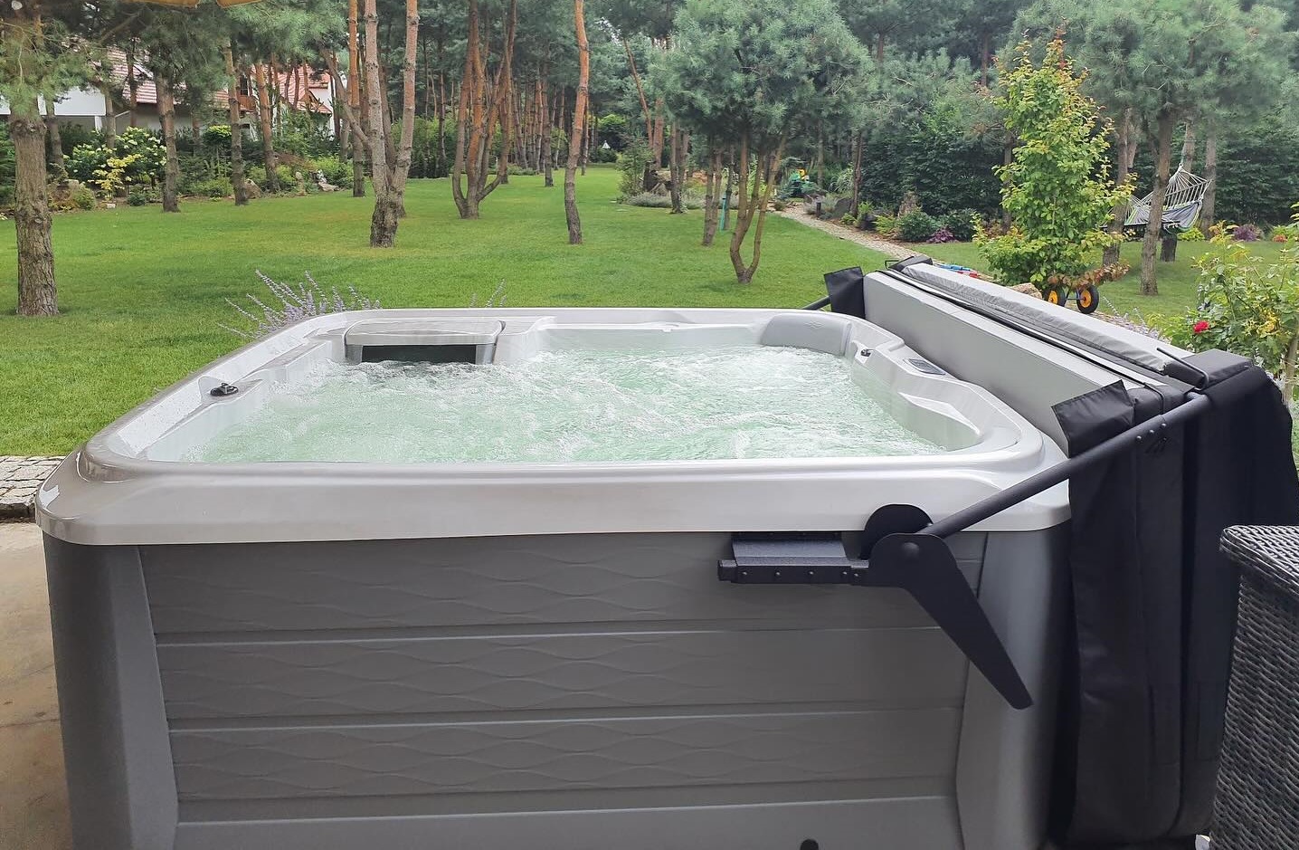 Układ niecki pozwala na wspólny relaks nawet 5 osobom, a dzięki leżance może być też świetnym wyborem dla 2–3 regularnych użytkowników, którzy lubią mieć w jacuzzi swoje „stałe miejsce”.